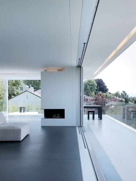 The electric drive allows simple and virtually noiseless operation of the sliding elements at the press of a button. The drive is concealed in the ceiling section and allows the window fronts to move automatically.